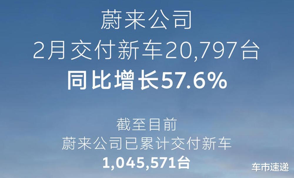 3月1日,蔚来汽车官方宣布,2026年2月销量20797台,同比增长57.6%。