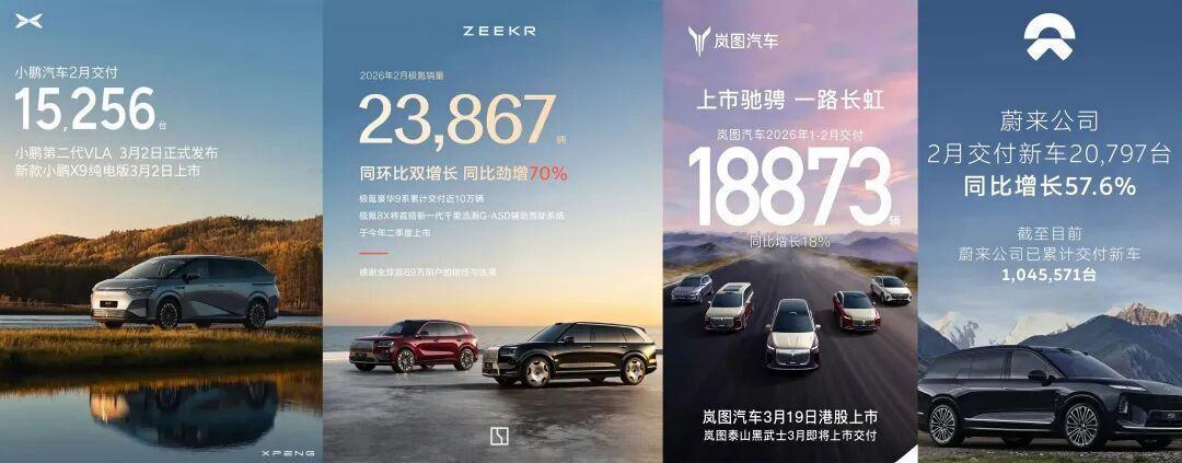 当然,2月车市也并非全无亮点。在逆势增长的阵营中,极氪以70%的同比增速领跑,蔚来紧随其后录得57.6%的增幅——这两家恰恰是在2月覆盖7年低息金融政策的品牌。此外,零跑以全系交付超2.8万台、同比增长10.9%的成绩位列新能源榜首。