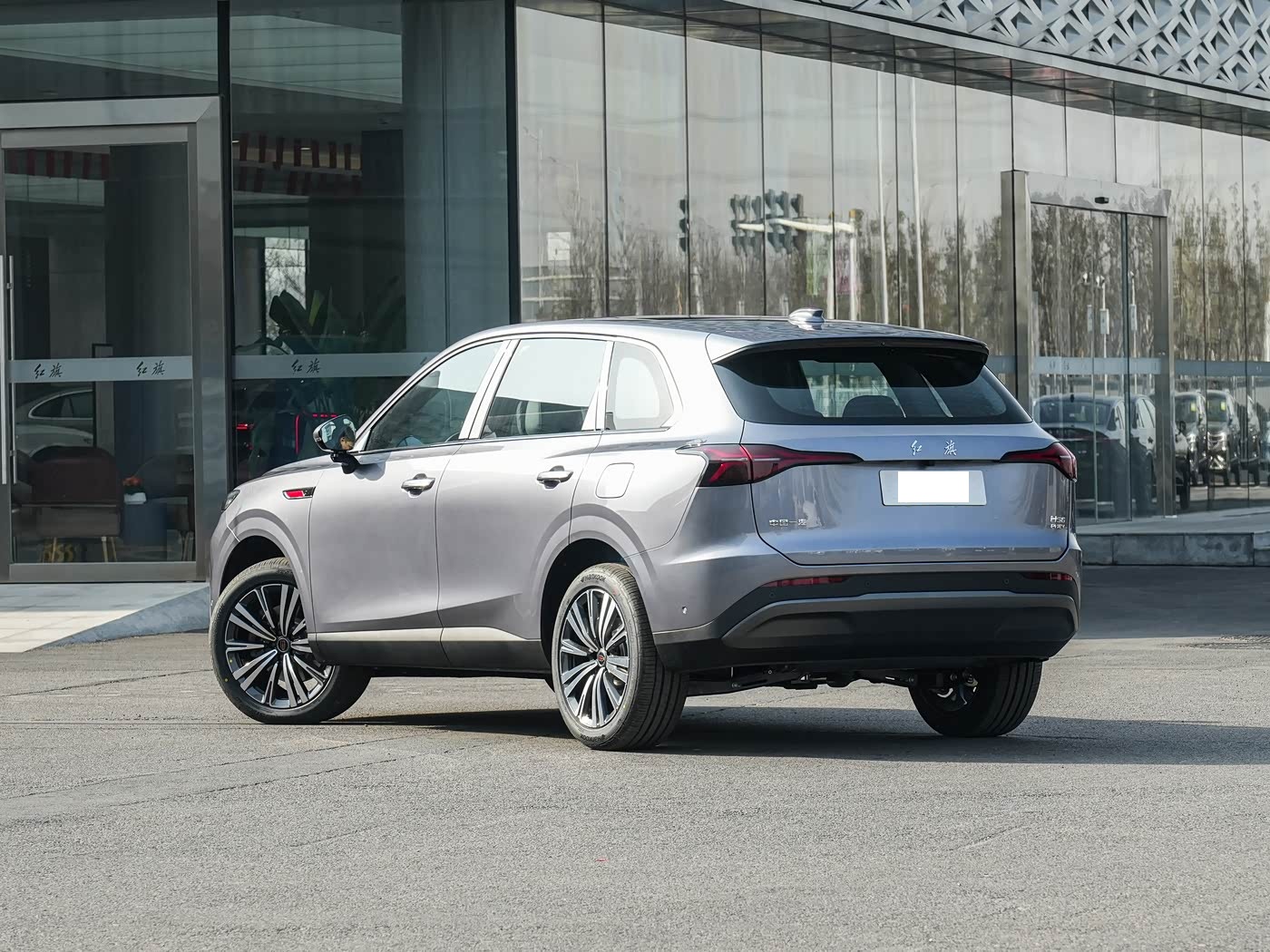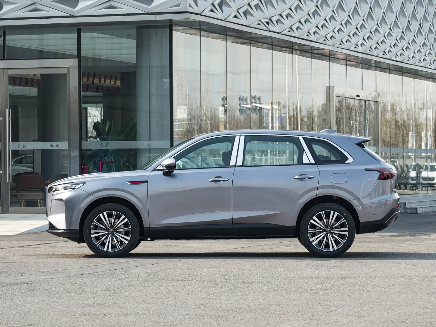 我们首先来看新车的外观设计方面,红旗HS6 PHEV延续家族式“东方原生设计”语言,前脸以“高山飞瀑”直瀑式进气格栅为核心,纵向排列的镀铬饰条规整大气,搭配中间的红旗立标,彰显中式豪华的庄重与底蕴,格栅边缘做细腻的圆角处理,避免生硬感,兼顾气场与精致度。两侧配备“龙睛”LED大灯组,造型灵动犀利,内部灯组结构精致,支持自适应远近光与自动点亮功能,夜间照明效果出色,点亮后宛如龙睛视物,辨识度拉满。发动机舱盖上隆起的筋线勾勒出饱满的肌肉感,前包围两侧设有贯穿式导流槽,既优化空气动力学性能,又强化层次感。