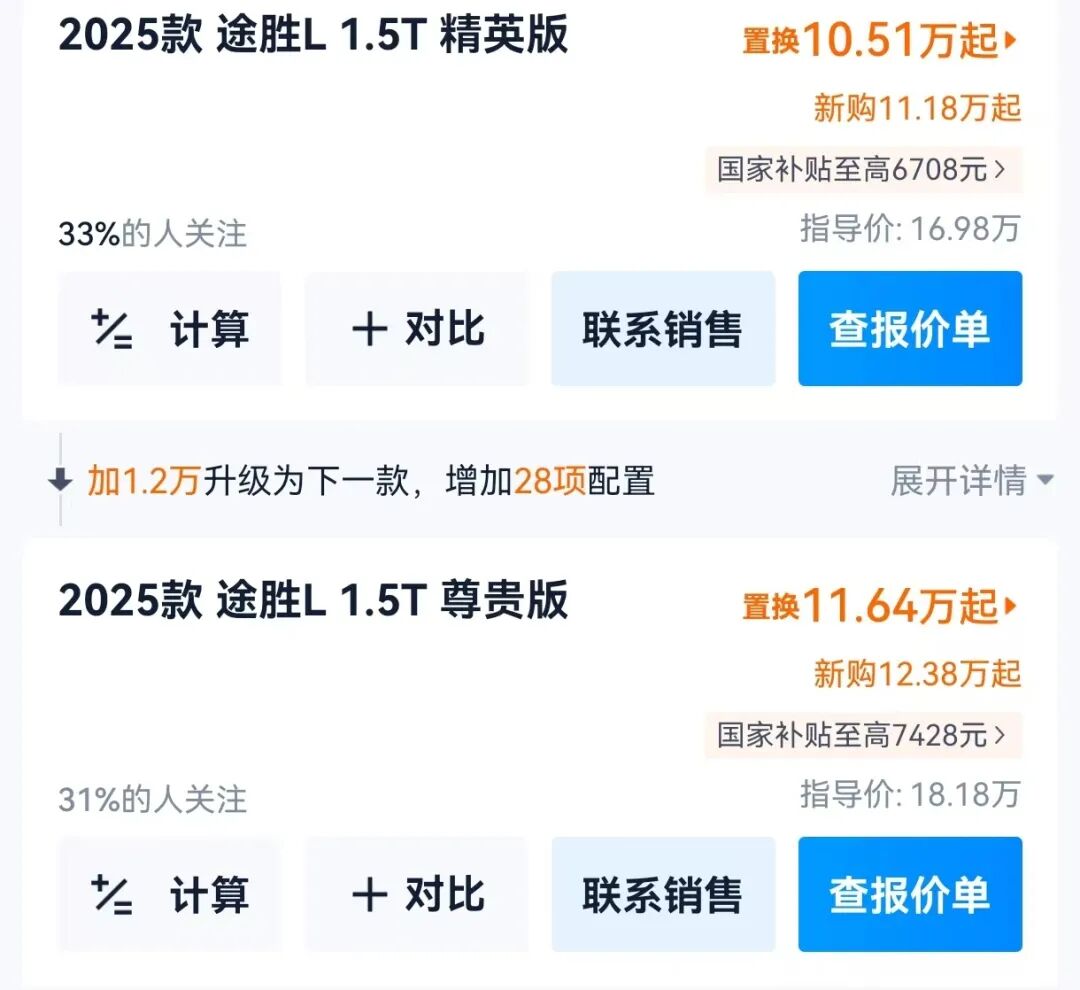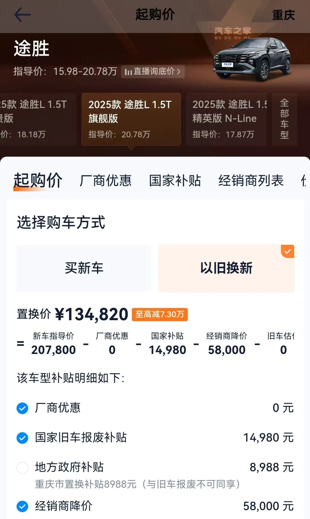 我在汽车平台上看到,以目前销量最大的2025款途胜L 1.5T旗舰版为例:指导价20.78万、厂商优惠0元、国家旧车报废补贴14980元(2013年之前购买上牌的作报废车)、地方政府补贴8988元(还专门备注重庆市置换补贴8988元,与旧车报废不可同享),经销商降价58000元。综上所述:置换价134820元(至高减7.3万元)