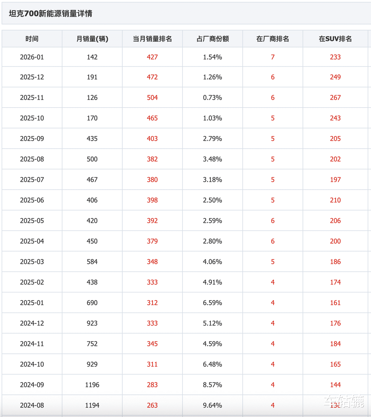 坦克700新能源,这款被长城汽车寄予厚望的旗舰硬派SUV,自2024年上市以来始终面临“叫好不叫座”的尴尬局面。2026年1月,坦克700新能源仅售出142辆,在硬派越野销量榜上位列第19,与同门坦克300的3929辆形成巨大反差。究其原因,这款顶配售价高达70万的国产越野车,正经历着从产品力到市场接受度的多重考验。而刚刚亮相的搭载2.0T插混系统的新款坦克700 Hi4-Z,能否扭转颓势?