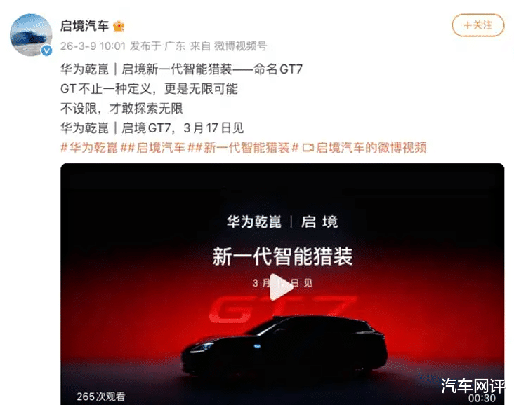 3月9日,启境汽车官方正式官宣,品牌首款车型定名启境GT7,全球首发亮相时间锁定3月17日。作为广汽集团与华为乾崑深度共创的开山之作,新车定位中大型智能猎装轿跑,预计今年6月正式上市,剑指30万元级高端新能源市场。