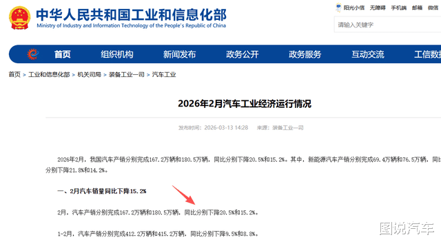 首先说下当今的车市背景,根据工信部发布的消息,2026年2月,我国汽车产销分别完成167.2万辆和180.5万辆,同比大跌20.5%和15.2%,而1-2月份产销同比下跌9.5和8.8%。2025年2月的产销数据为210.3万台和212.9万台。