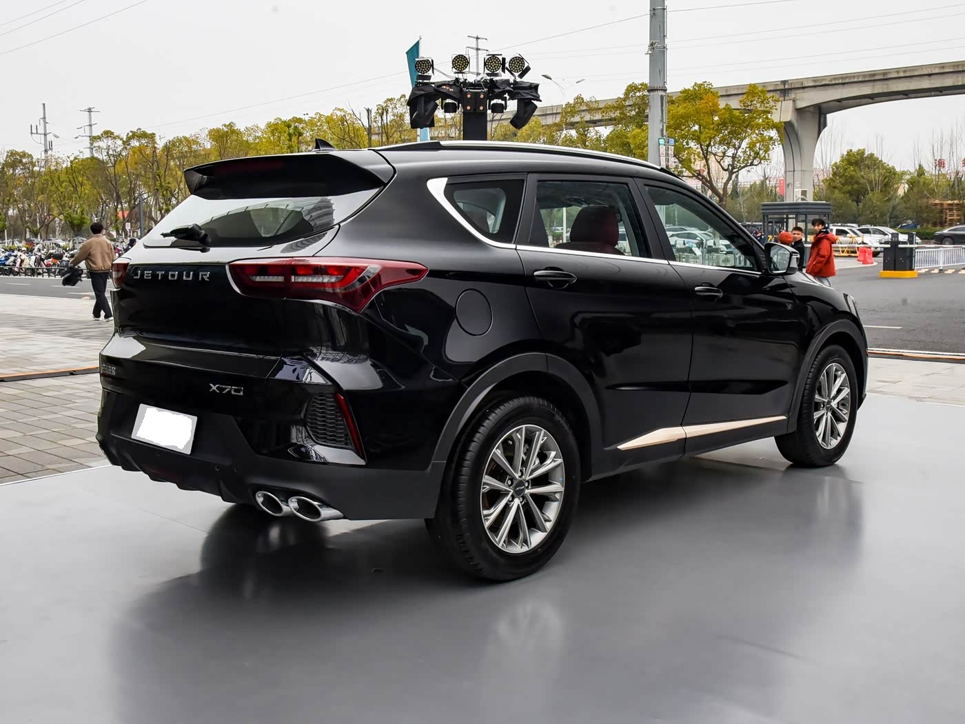 再来看车尾部分,车尾设计延续了简洁大方的风格,贯穿式LED尾灯组是视觉焦点,点阵式光源点亮后辨识度极高,与前大灯组形成呼应,提升了整车的协调性。尾灯中央镶嵌着英文“JETOUR”标识,取代了传统车标,进一步凸显了品牌的年轻化定位。下方保险杠造型饱满,中高配版本配备双边共两出的排气装饰,虽然为装饰件,但有效提升了车尾的运动感。