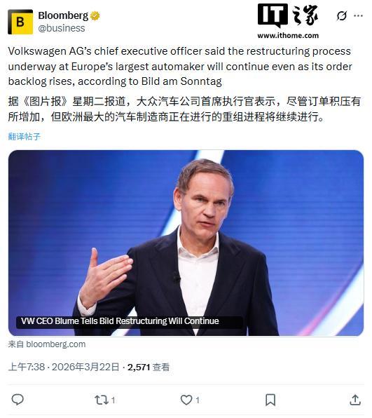 IT之家3月22日消息,大众汽车集团CEO奥利弗·布鲁姆今日在接受德国媒体采访时表示,德国汽车工业可以向中国学习其严谨有序的产业规划。目前,大众正积极推进深度重组,以保持竞争力。