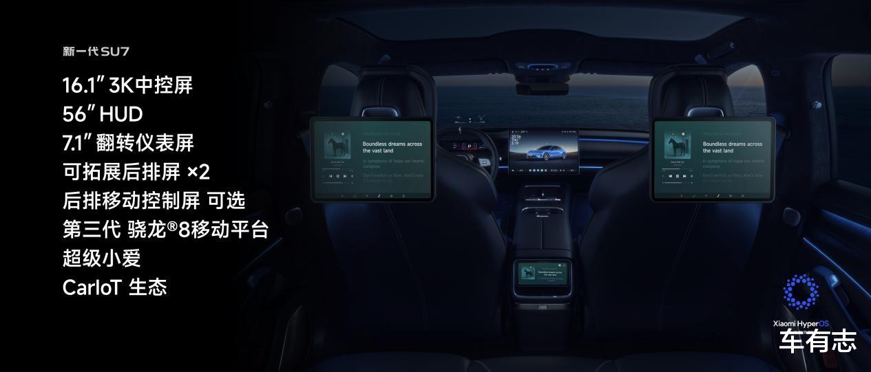 智能座舱方面,新一代SU7全系标配澎湃智能座舱,搭载第三代骁龙8移动平台和英伟达Thor车载计算平台(算力700TOPS)。「超级小爱」新增陪伴功能,支持跨会话长记忆、模糊导航规划及屏幕内容识别能力。后排配备可移动控制屏幕,支持六屏联动。