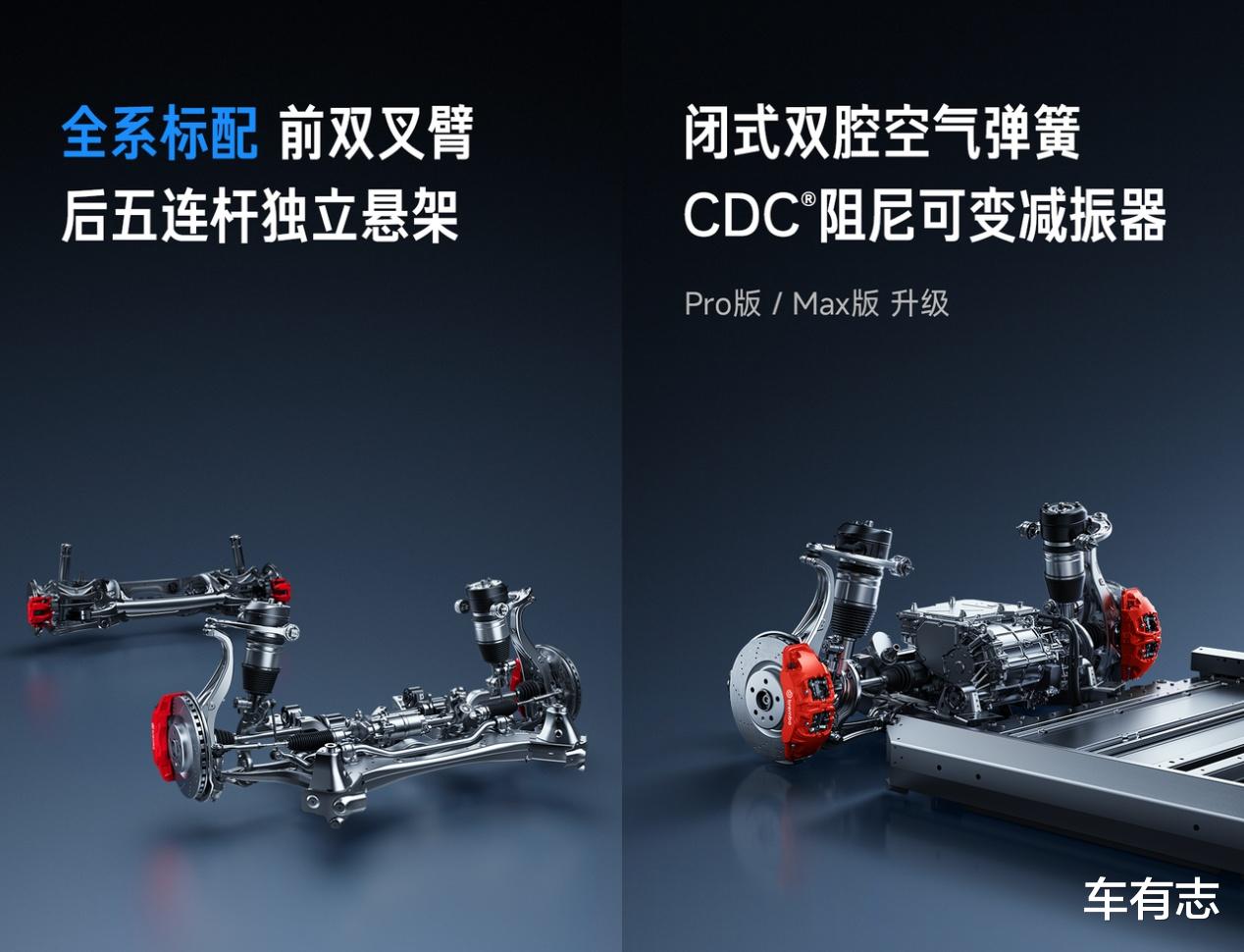 底盘方面,新车首发「小米蛟龙底盘」,Pro版和Max版配备闭式双腔空气弹簧和CDC阻尼可变减振器,支持悬架高度50mm范围内四挡可调。转向比12.5:1,转弯直径11.4米,优于同级平均12米水平。全系标配前四活塞固定卡钳和后265mm宽胎,制动与操控性能进一步提升。