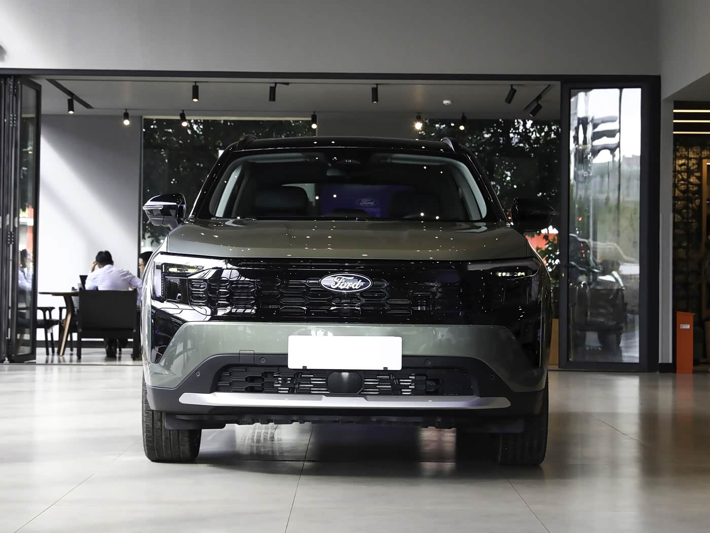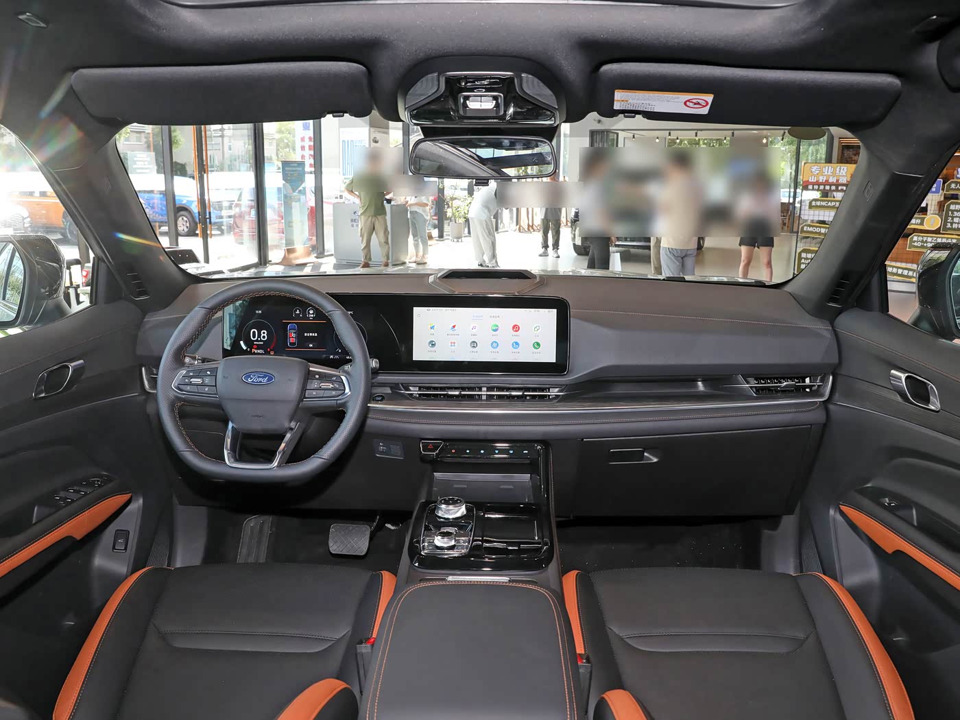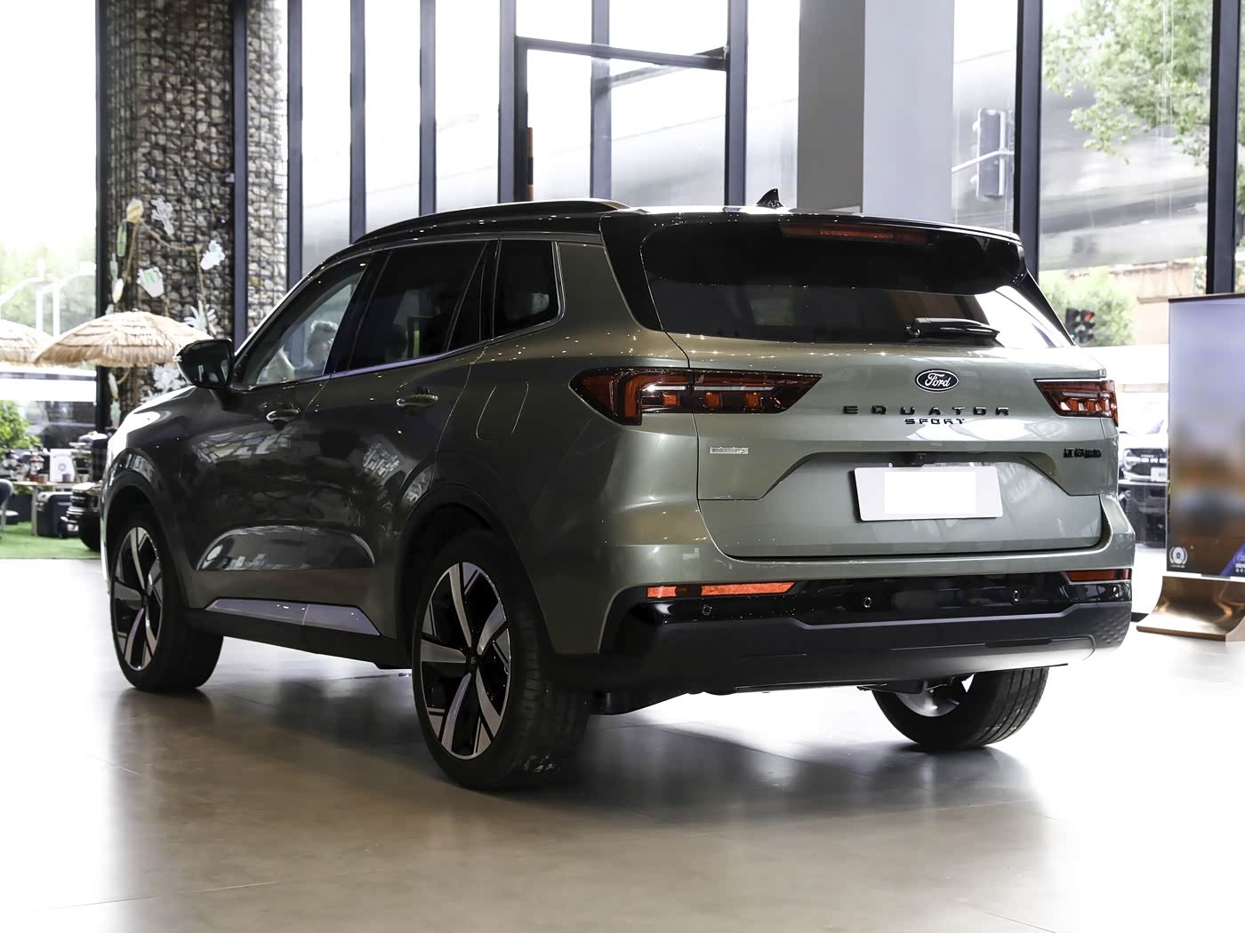 再来看车尾部分,车尾设计延续整车硬朗简约基调,造型饱满立体、层次分明,对称式布局尽显家用车的稳重质感,与前脸设计遥相呼应。上方配备小型扰流板,优化空气动力学性能, subtly提升运动氛围,高位刹车灯醒目,保障行车安全。两侧L型星耀LED尾灯与前大灯造型一致,内部结构精致,点亮后光照均匀,刹车、转向时动态提示清晰,夜间行车安全性拉满。尾灯之间用镀铬饰条连接,印有FORD英文标识,进一步拉伸尾部视觉宽度。车尾下方采用隐藏式排气布局,搭配大面积熏黑护板与镀铬装饰,整体干净利落,贴合家用SUV定位。