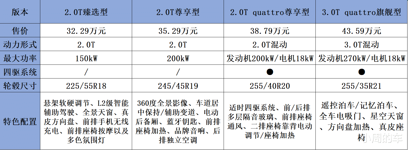 全新奥迪A6L提供了多套动力总成可选择,涵盖了2.0T高低功率、2.0T混动以及3.0T混动(V6发动机)。