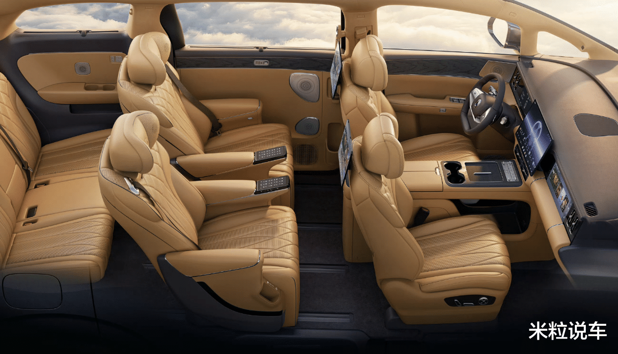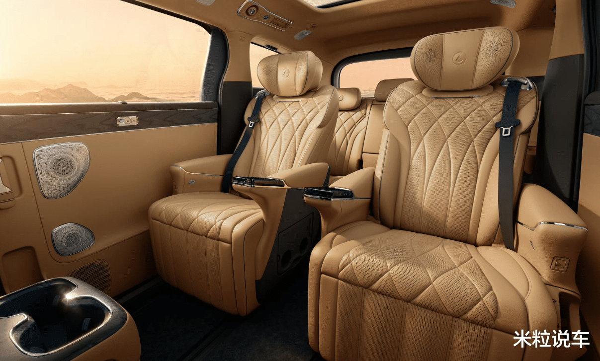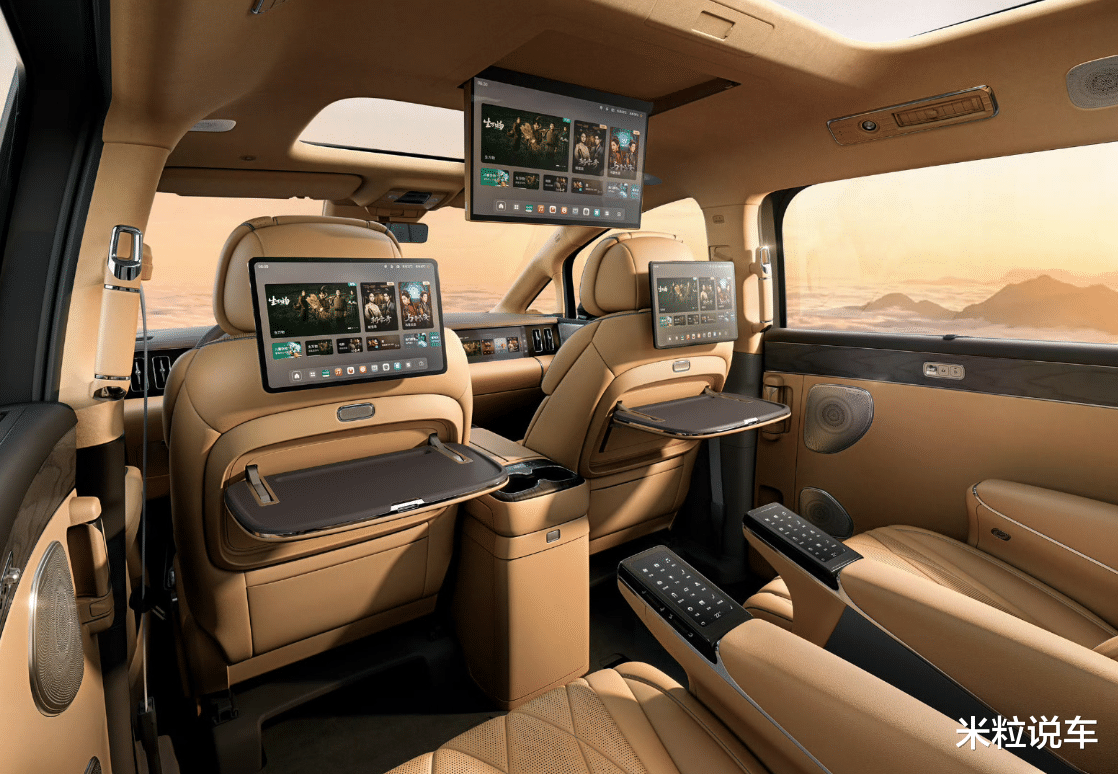 第2排尊贵感更是突出,除了两个航空座椅外,还拥有三个彩色屏幕的设计。这样设计的好处就是兼顾到了第2排与第3排的观影效果,而且座椅调节按键,包括加热、通风以及座椅前后移动,靠背调节全部都设计成了触摸屏幕功能。为了带来更好的隐私感,还采用了防晒网设计,而且第2排也搭载了头枕音响,豪华属性不言而喻。