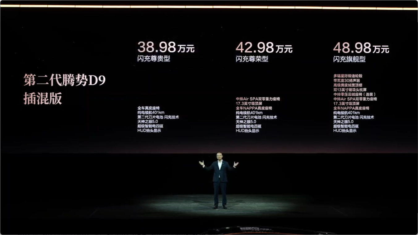 动力方面,第二代腾势D9提供插电混动与纯电两种动力形式。插混版车型搭载由1.5T发动机与双电机组成的混动系统,发动机最大功率115kW,前电机最大功率200kW,后电机最大功率45kW,配备第二代刀片电池,CLTC纯电续航里程突破400公里,并支持闪充技术,馈电油耗为6.35L/100km。