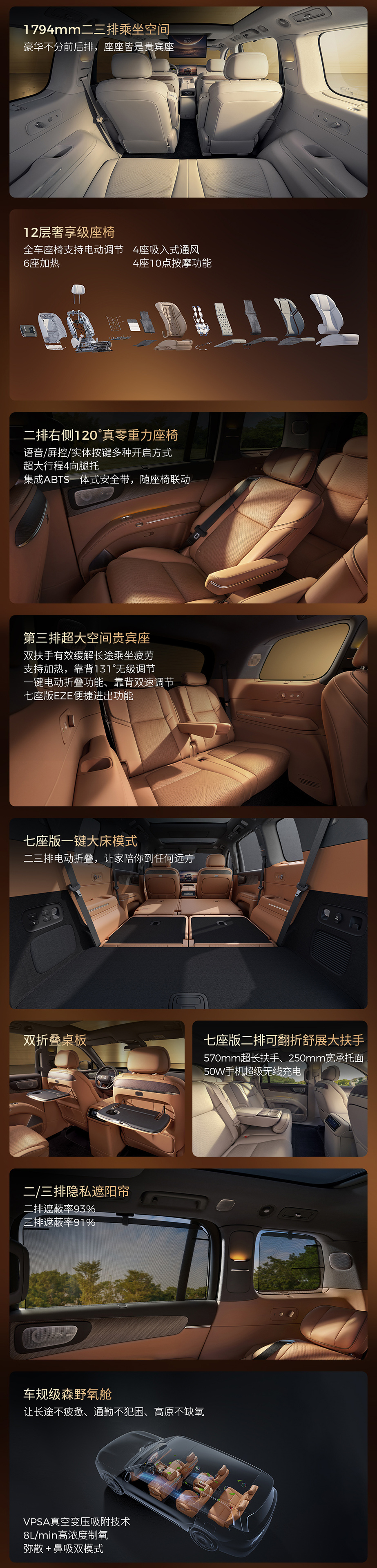 车辆二排将配备零重力座椅、双折叠桌板、头顶娱乐屏、冰箱以及功能控制屏。此外,新车还设置了B柱拉手,方便儿童、老人下车。三排配备了双扶手、一键电动折叠、座椅加热功能。