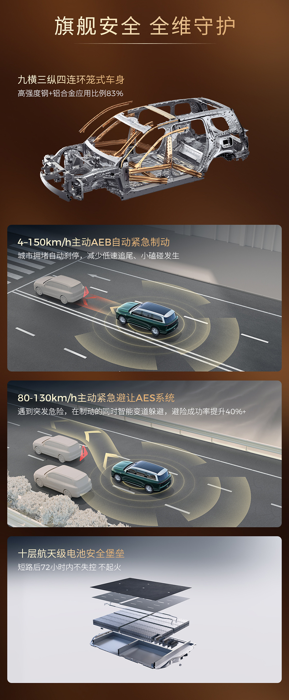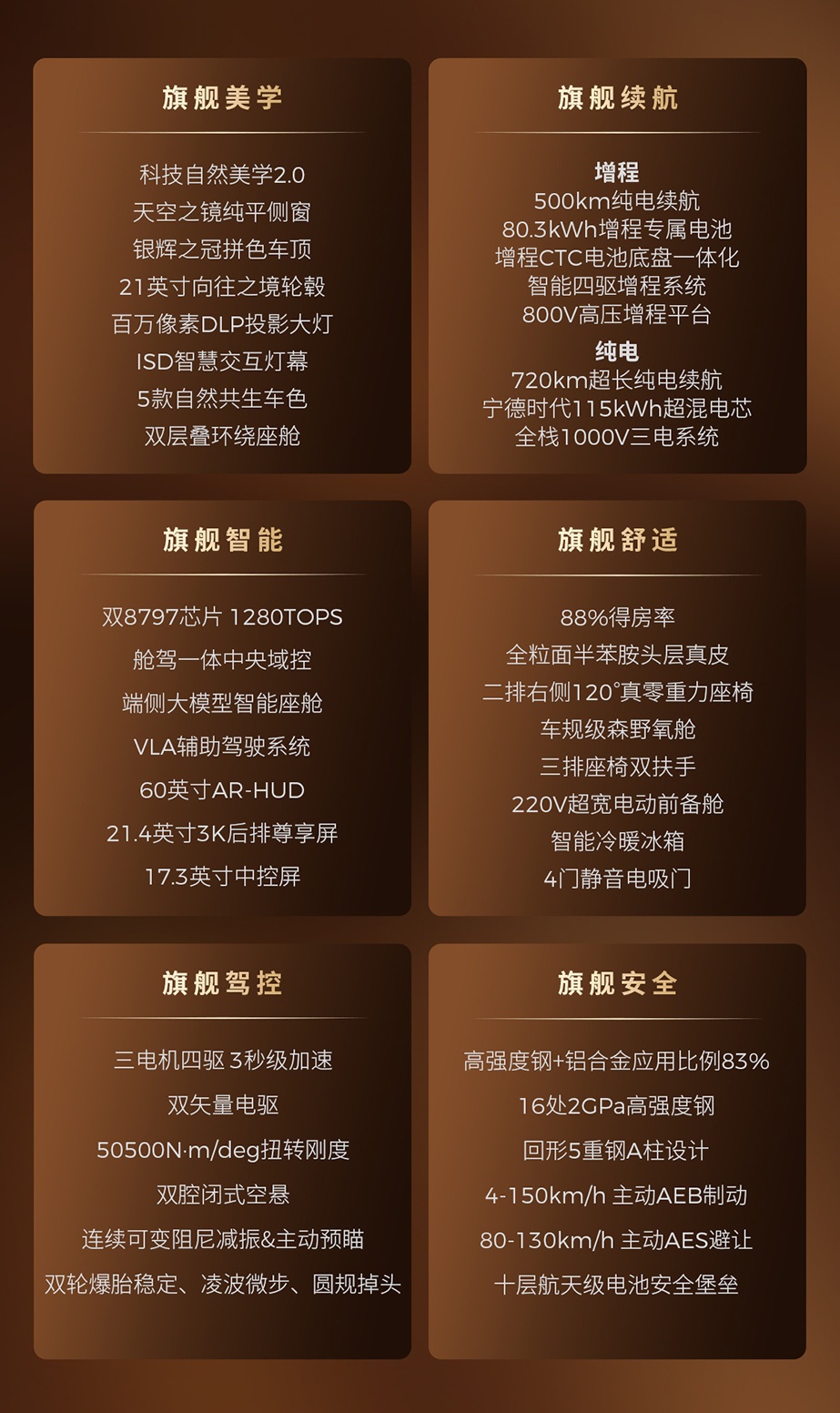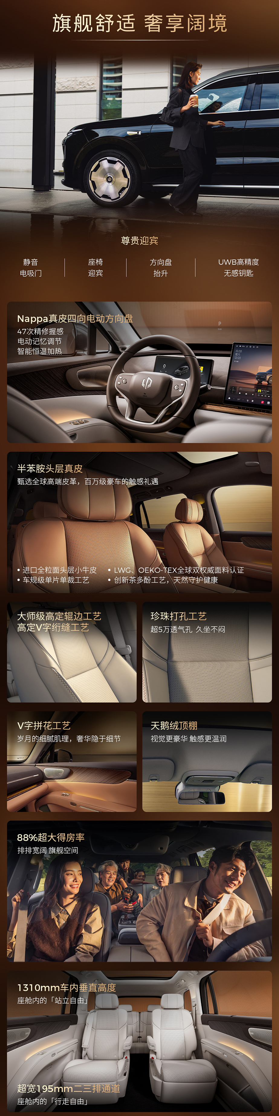 新车长宽高分别为5252/1995/1780mm,轴距为3110mm,提供6座/7座可选;搭载双8797芯片、80.3kWh超大增程专属电池(宁德时代超混电芯)、车规级森野氧舱、电动开合冷暖冰箱、12层奢享级座椅、二排右侧真零重力座椅、三排超大空间贵宾座。