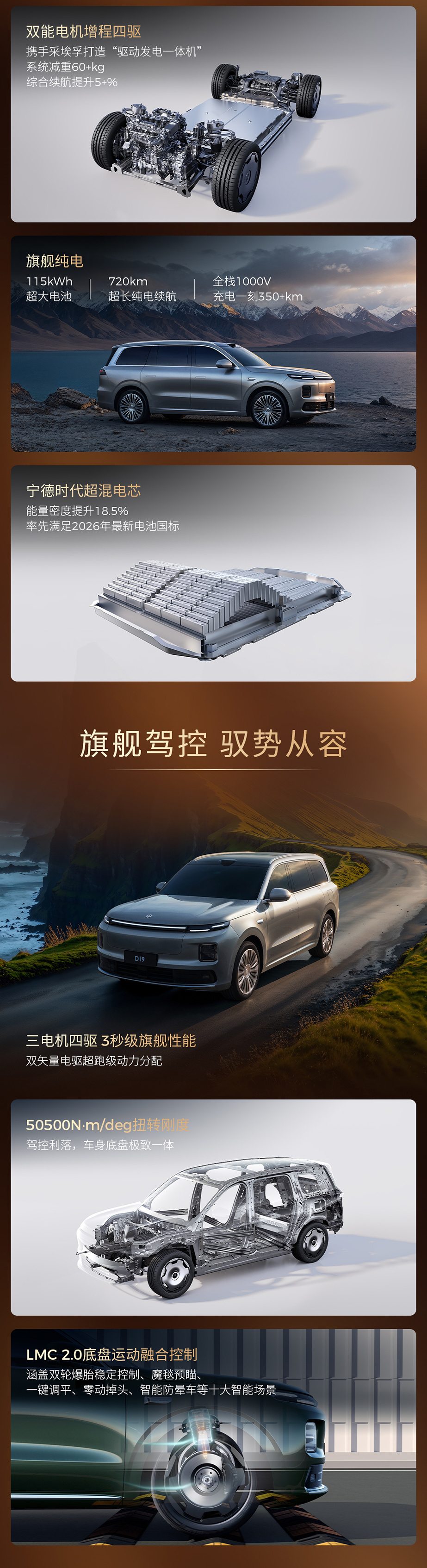 零跑D19增程版搭载增程CTC电池技术,系统综合功率400千瓦,轮端扭矩7850牛・米,配备80.3kWh大电池,支持800V快充;纯电续航里程可达500km,并配备智能四驱系统。