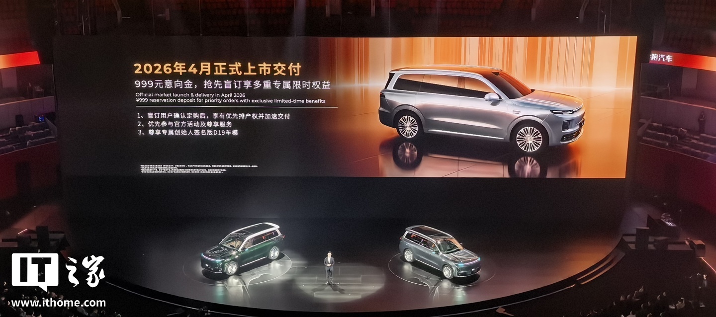 零跑D19已于去年11月1日正式开启盲订,支付999元意向金可享优先排产、限量2000份创始人签名D19车模及后续活动优先参与权+尊享服务在内的多项权益。