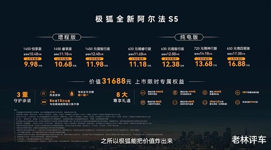 今天要说的车型就和华为有着千丝万缕的联系,它就是极狐阿尔法S5。该车有增程版和纯电版,售价10.48-17.38万元,上市补贴价为9.98-16.88万元,相当于在售价的基础上又便宜了5000元。