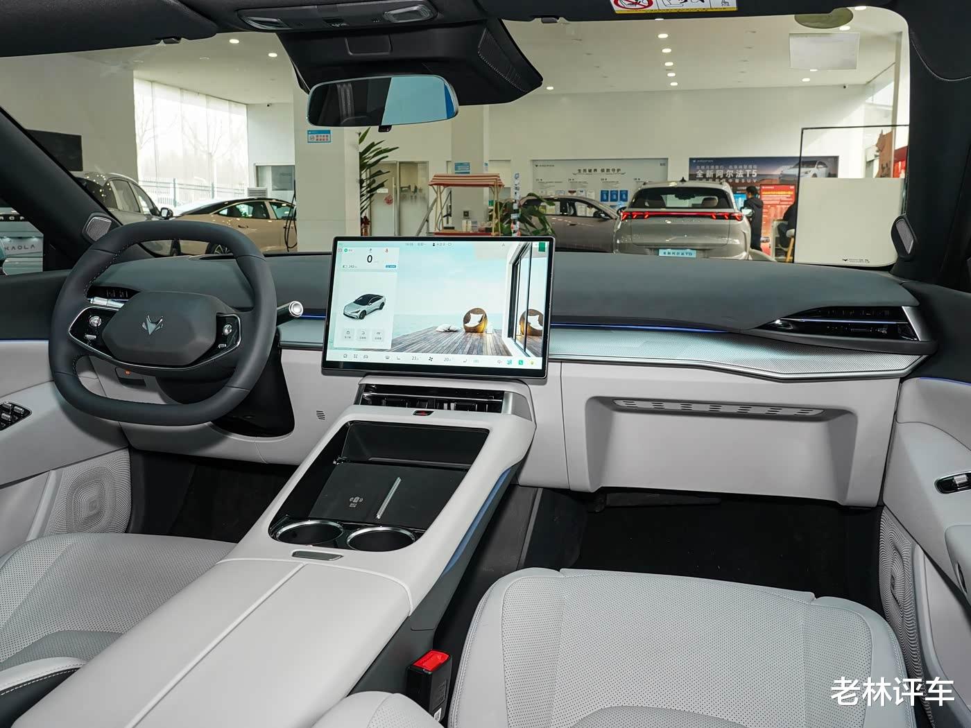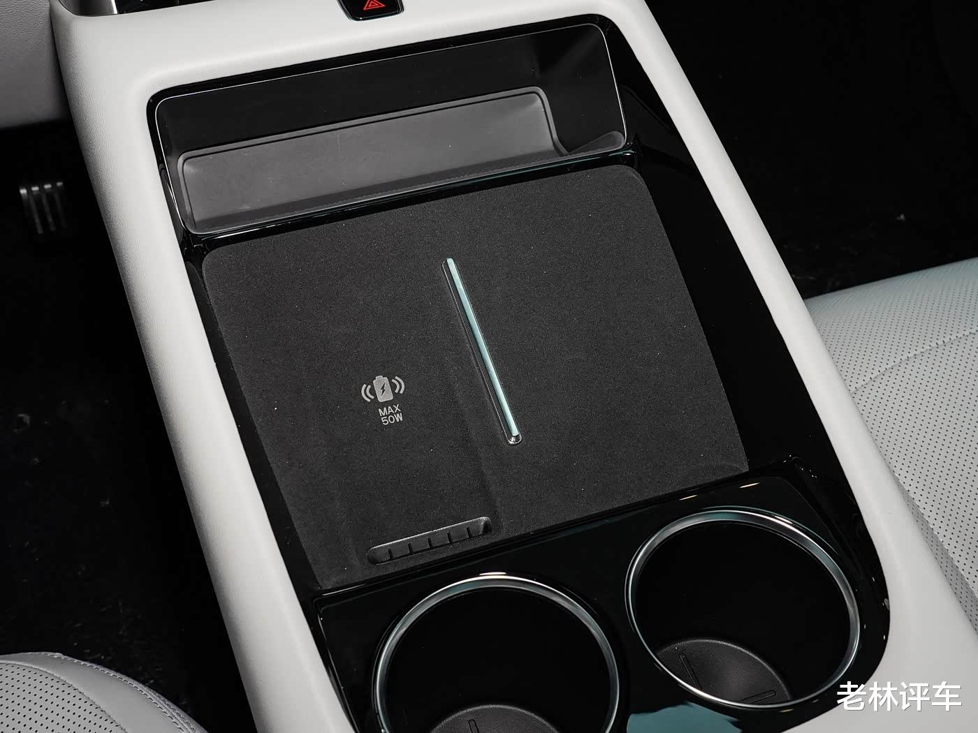 该车采用的电子怀挡,前排配有50W手机无线充电面板。