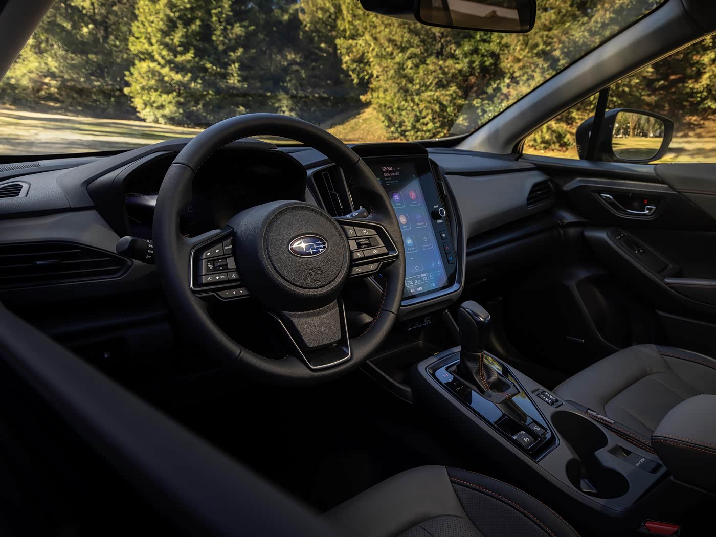 进入车内,内饰采用斯巴鲁最新实用化豪华座舱,环抱式布局,用料与配置全面升级,兼顾操控便捷与家用舒适。中控台分层设计,大面积软质搪塑、皮质包裹、金属饰条覆盖,中控台向驾驶位倾斜,操作更顺手。搭载11.6英寸竖置中控屏 + 12.3英寸全液晶仪表,搭载最新 Starlink 车机系统,支持 CarPlay/HiCar、导航、语音控制、OTA 升级,界面简洁、反应流畅,满足日常智能需求。