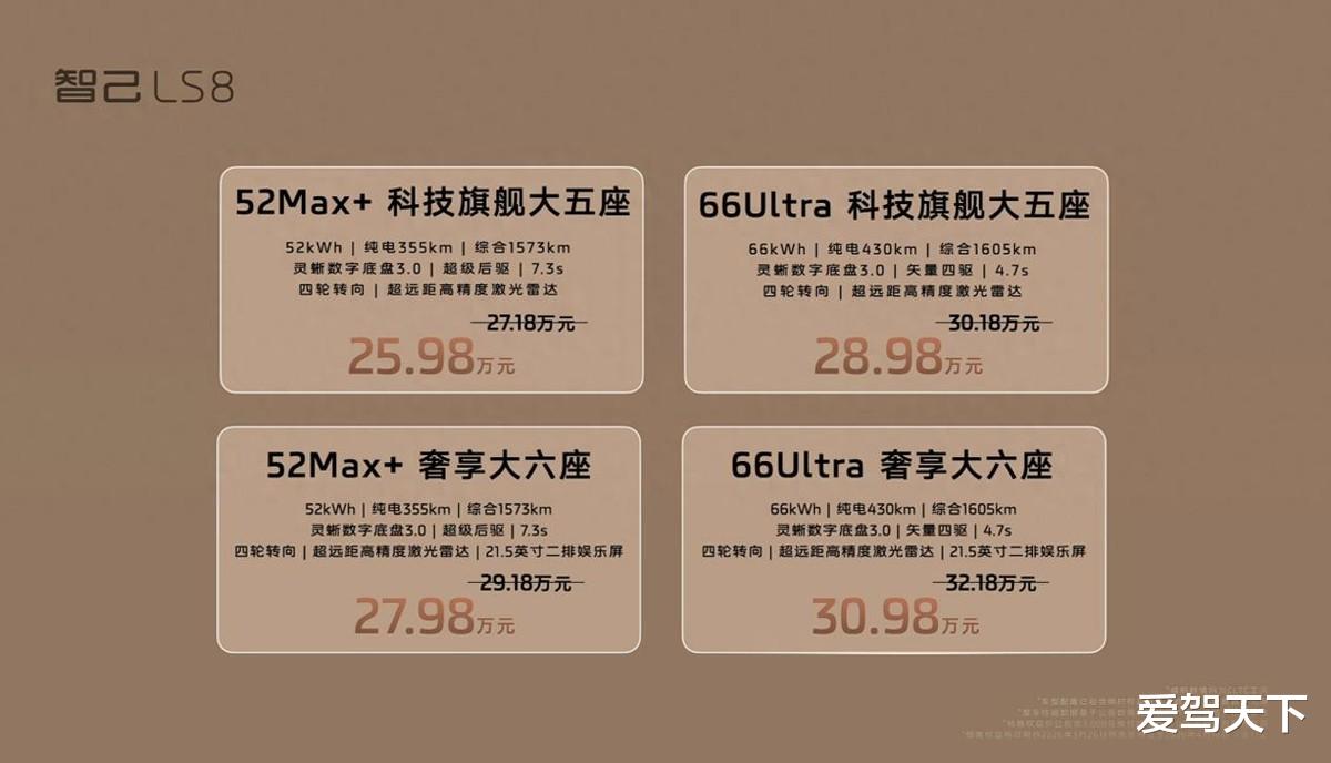智己LS8全系搭载1.5T增程动力,提供单电机后驱和双电机四驱两种,并基于800V平台打造。其中,后驱版纯电续航可达355km,综合续航为1573km;四驱版纯电续航430km,综合续航为1605km。