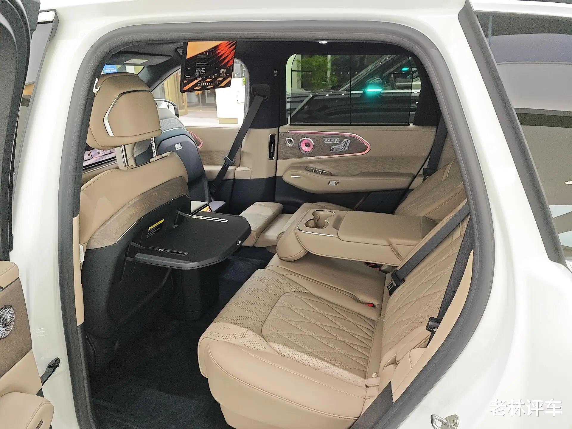 相较于极氪9X全系均是6座布局,极氪8X则全系都是5座布局,形成了强烈的风格差异。得益于该车中大型SUV的定位,采用5座布局的话,后排空间十分宽敞,还标配车载冰箱、29喇叭的杜比全景声音响、1680万色内饰氛围灯、后排小桌板、前/后排座椅加热/通风/按摩、后排座椅腿托调节/脚踏调节等,除了标配和次低配车型外,其余车型还配备了17英寸的3K后排吸顶娱乐屏幕。