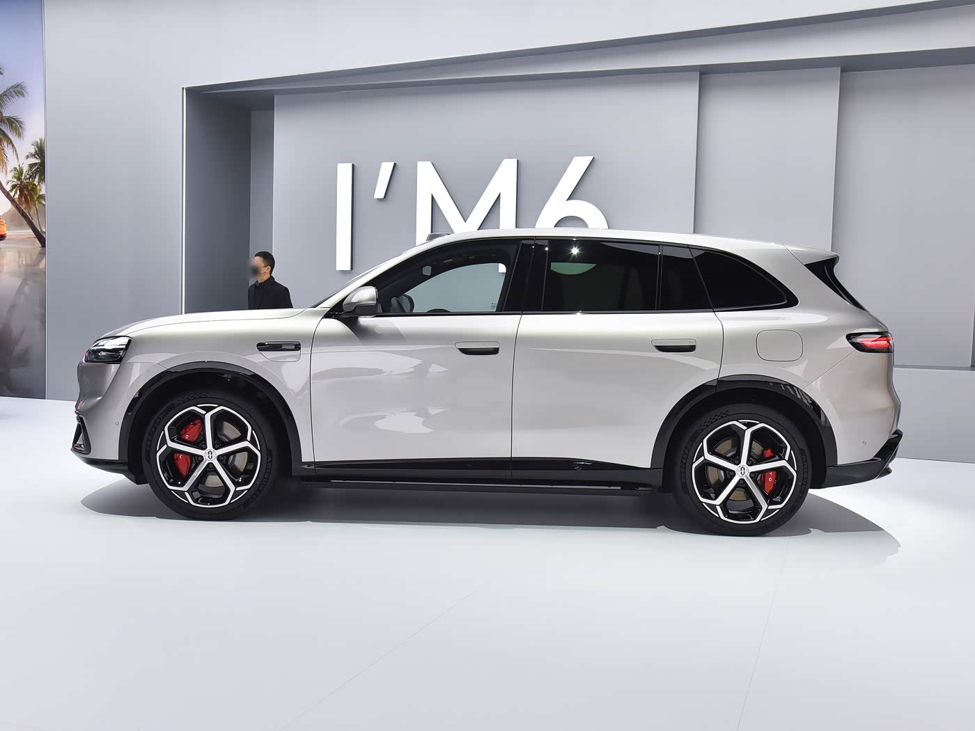 再来看车身侧面部分,车身尺寸4960/1985/1736mm,轴距2950mm,接近中大型SUV门槛却拥有紧凑灵活的视觉效果,在城市拥堵路段行驶毫无压力。侧面采用家族式圆润无腰线设计,但车顶略带溜背弧度、D柱前倾的设计,让它比理想L6更具动感;同时又不像小米SU7那样过度追求运动而牺牲后排空间,平衡了运动感与实用性。标配20英寸轮毂,还提供3款21英寸轮毂可选,胎宽升级至265mm,搭配四活塞红色卡钳,进一步强化运动基调。