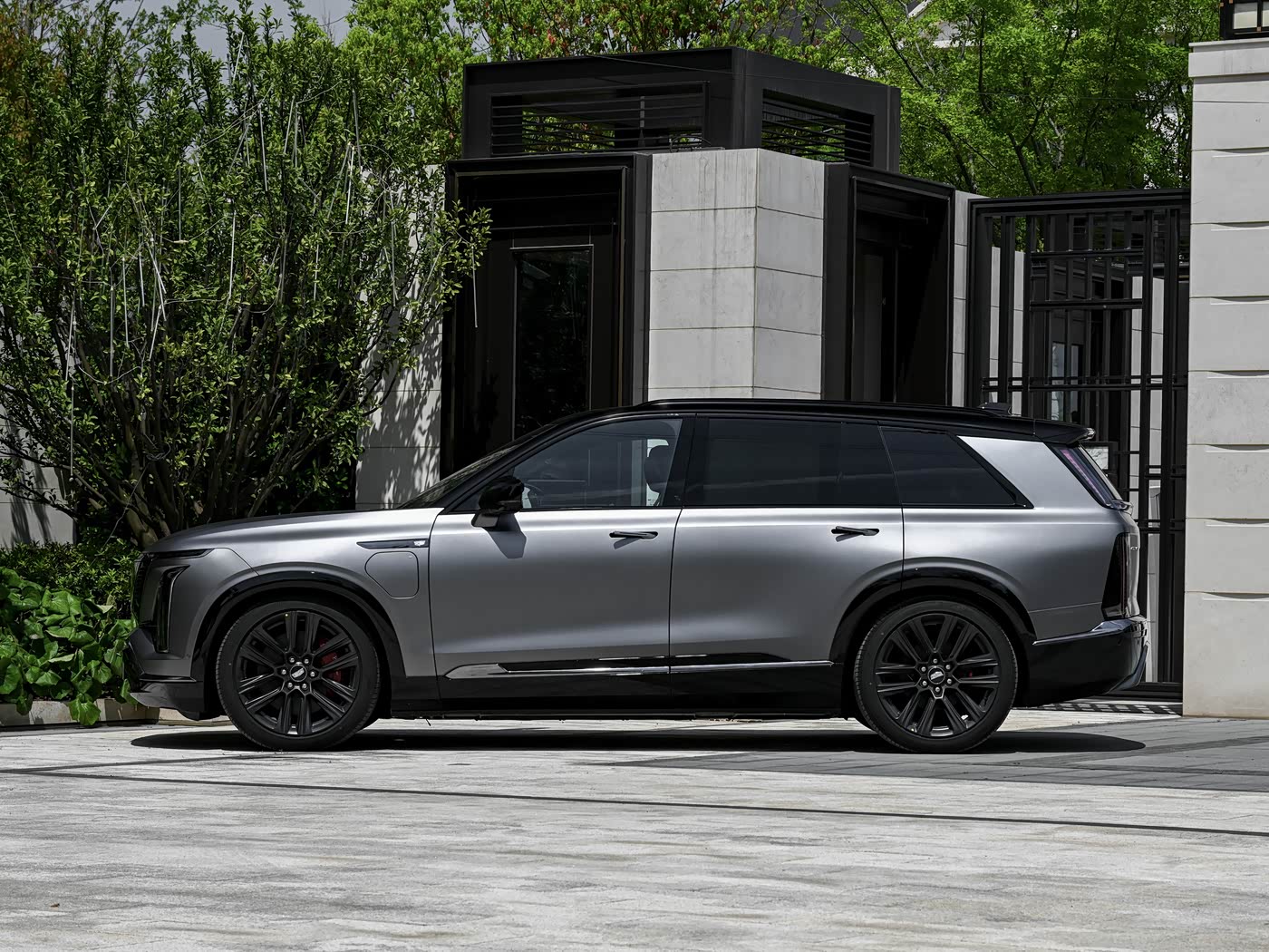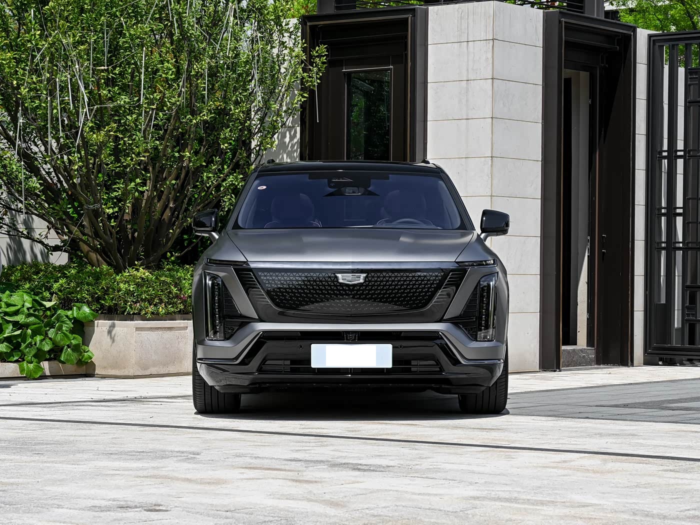 我们首先来看新车的外观设计方面,凯威德的车头设计,是凯迪拉克百年家族基因与纯电时代科幻感的完美碰撞。封闭式黑晶光耀格栅取代了传统燃油车的进气格栅,内部融入盾型中网结构,搭配悬浮于中网之上的凯迪拉克车标,辨识度瞬间拉满。格栅表面的几何纹理在光影下若隐若现,既彰显了纯电车型的科技属性,又保留了品牌特有的精致感。分体式大灯组是车头的一大亮点。上部星环贯穿式灯带与横向镀铬饰条平行排列,如同一条璀璨的光带横跨车头,点亮后极具视觉冲击力;下部纵向布局的直列式流光大灯,延续了凯迪拉克标志性的灯语设计,进一步强化了整车的磅礴气场。