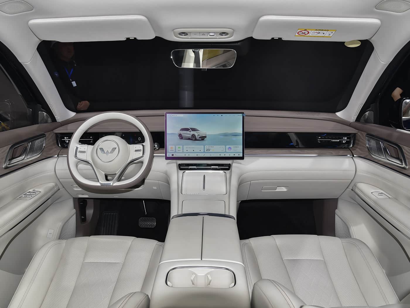 再来看车尾部分,车尾设计简约饱满、层次分明,与前脸星环美学呼应。顶部大尺寸扰流板优化风阻,高位刹车灯嵌入其中;贯穿式星环 LED 光幕尾灯纤细立体,内部 1000 + 颗灯珠均匀点亮,中央发光五菱标识强化家族符号。车尾中央内凹式设计增加立体感,牌照框区域精致内敛;下包围黑色护板 + 银色饰条点缀,与前脸、侧面设计统一。隐藏式排气布局让尾部干净利落,无多余线条,靠型面与光影塑造高级感,夜晚点亮后辨识度与豪华感拉满。