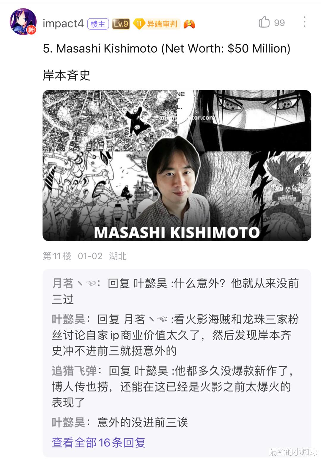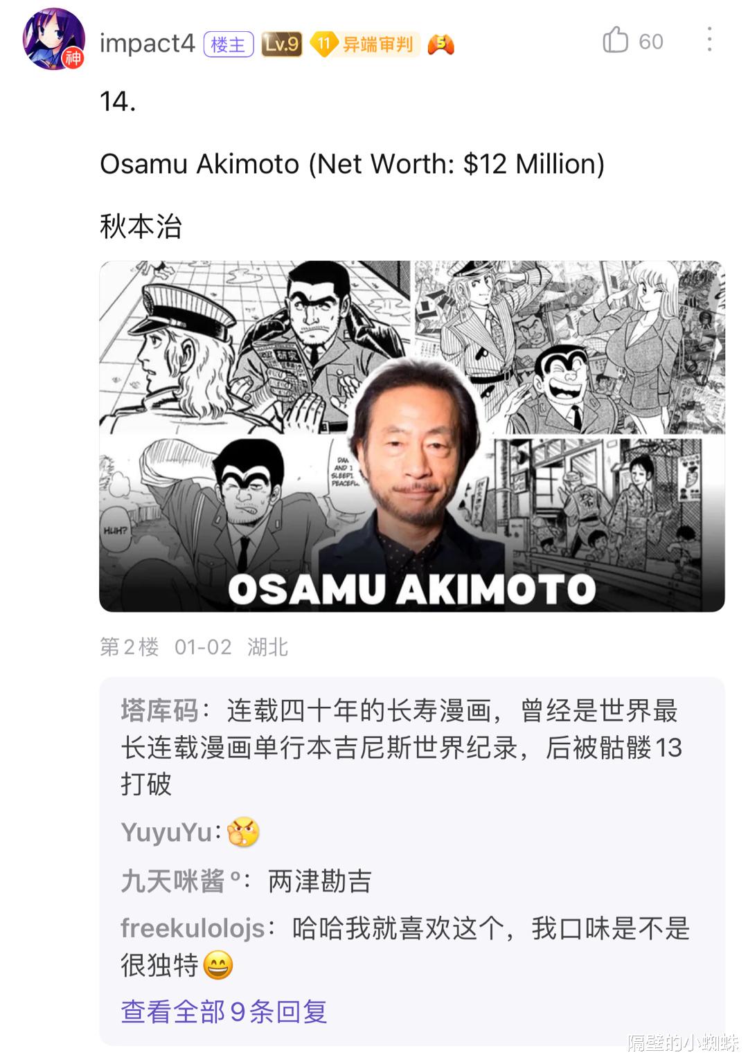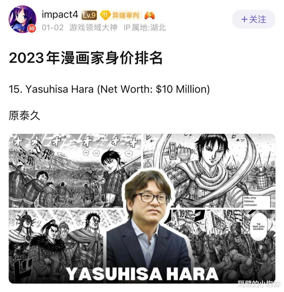 首先,第15名是原泰久,他的身价高达一千万美元!凭借着独特的画风和引人入胜的故事情节,他的作品在日本及全球范围内都受到了广泛的关注和喜爱。