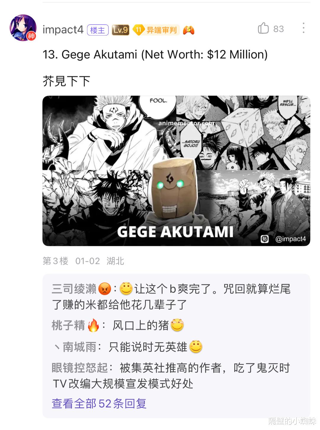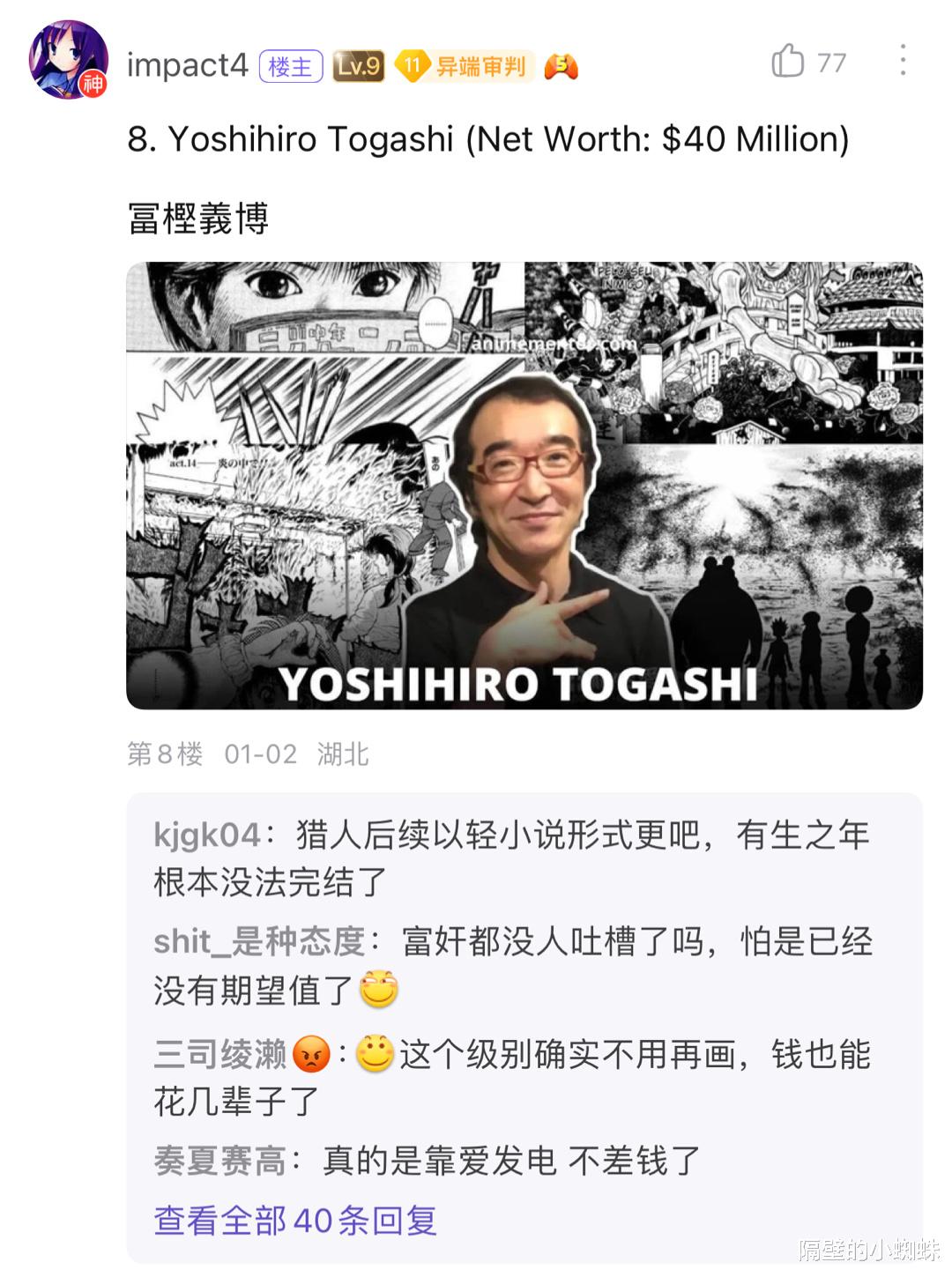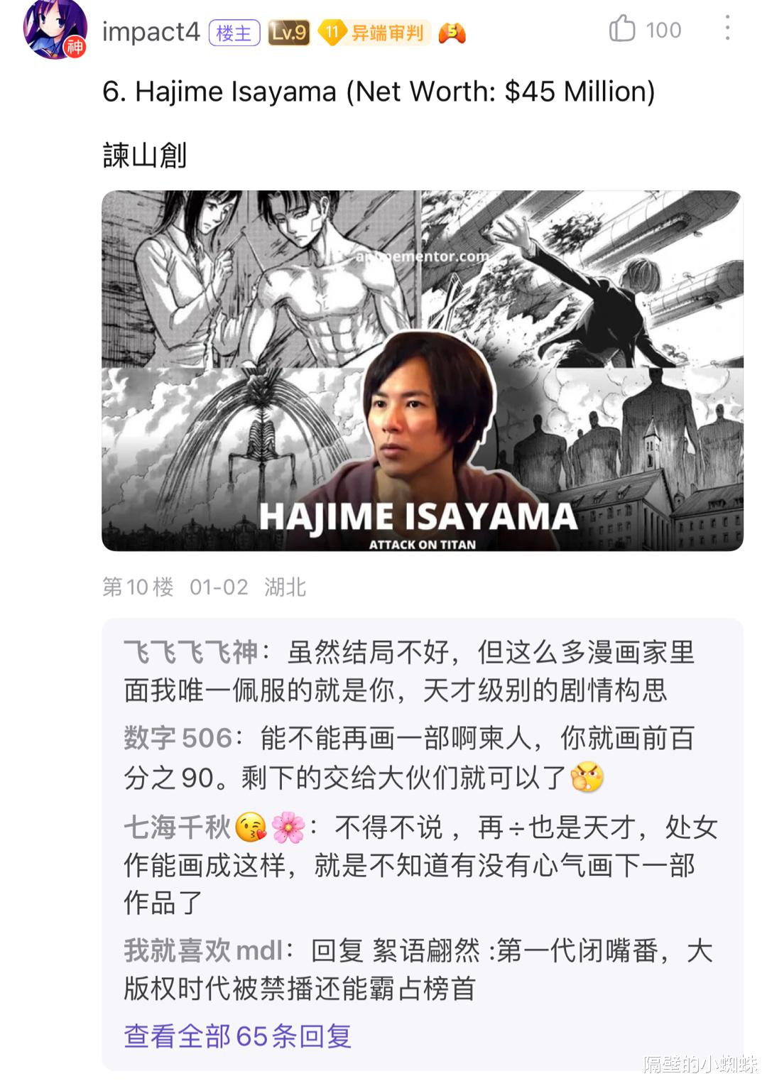 首先,第15名是原泰久,他的身价高达一千万美元!凭借着独特的画风和引人入胜的故事情节,他的作品在日本及全球范围内都受到了广泛的关注和喜爱。