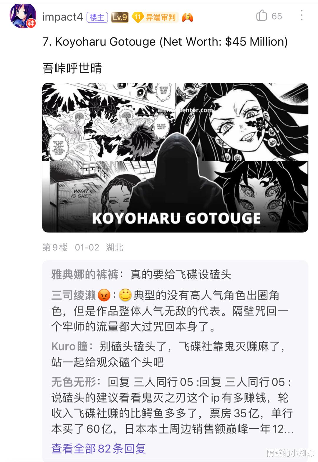 第7名是吾峠呼世晴,身价高达四千五百万美元。吾峠呼世晴的作品以独特的画风和深刻的人物塑造而著名,她的作品在全球范围内都受到了广泛的关注和喜爱。