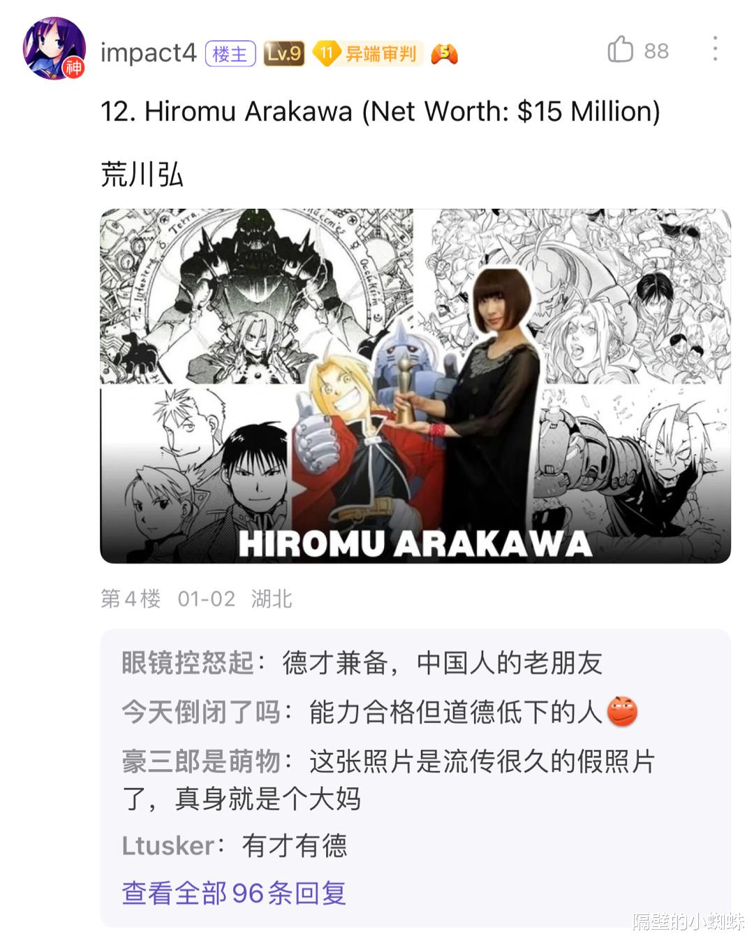 再往前看,第12名荒川弘的评分为一千五百万美元。荒川弘的作品风格独特,故事情节扣人心弦,深受广大读者的喜爱。