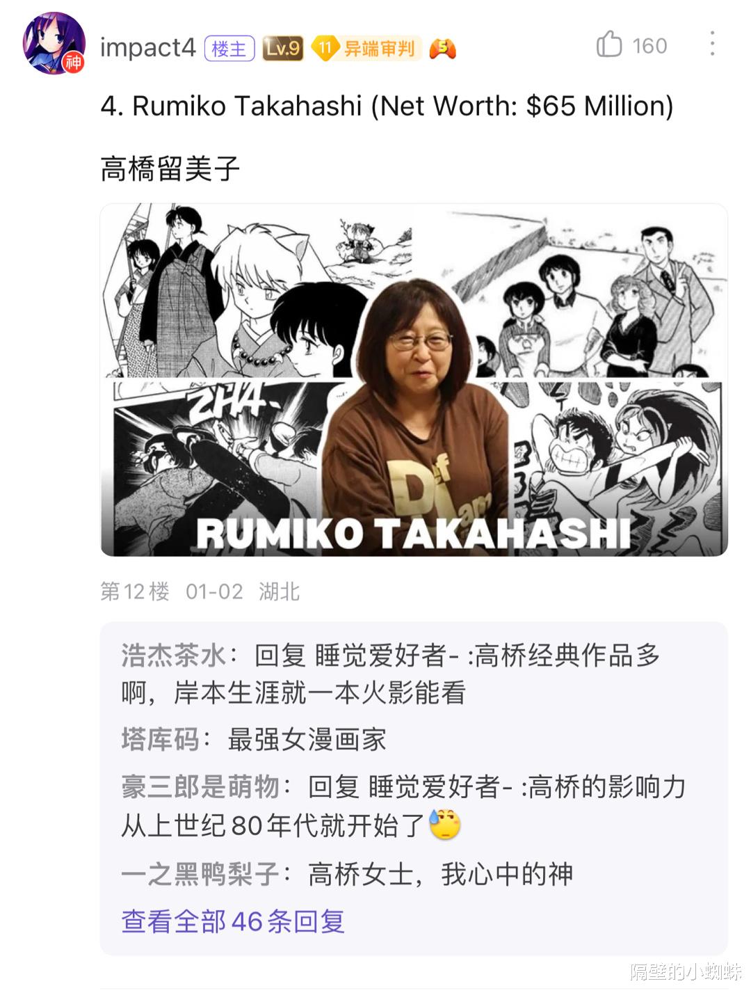第4名是高桥留美子,身价高达六千五百万美元。高桥留美子的作品以幽默风趣、人物刻画细腻而著称,她的作品在全球范围内都受到了广泛的关注和喜爱。