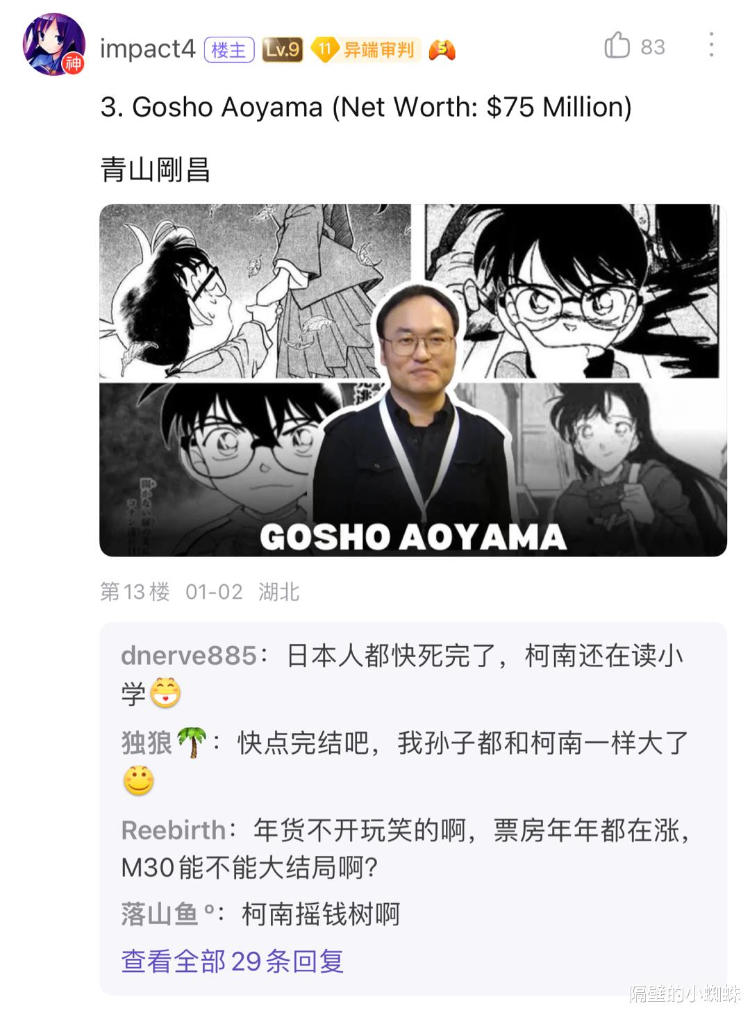第3名是青山刚昌,身价高达七千五百万美元。青山刚昌的作品以推理情节和人物刻画出色而著名,他的作品在全球范围内都拥有着广泛的读者群体。