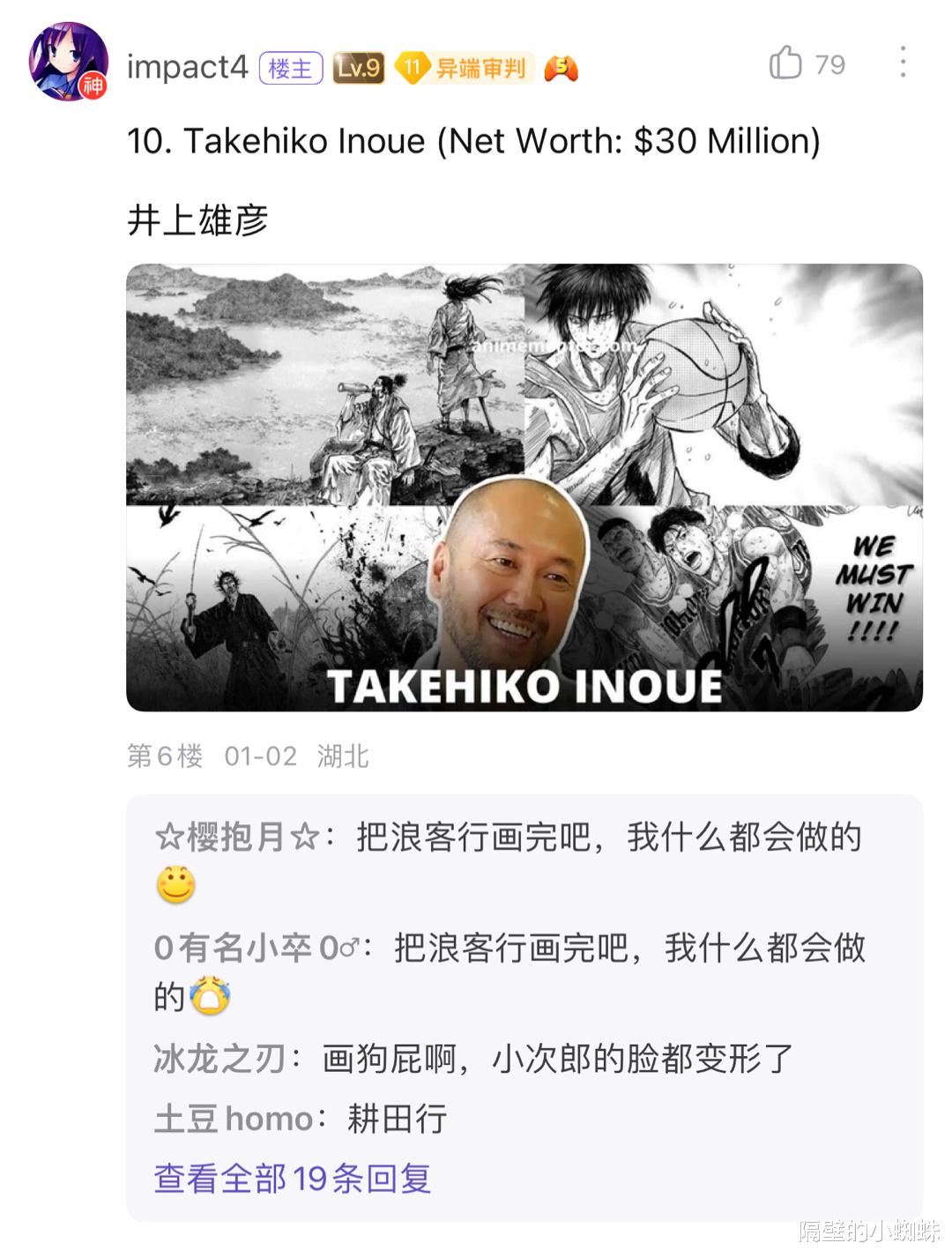 排在第10名的是井上雄彦,他的身价已经达到了三千万美元。井上雄彦的作品以精湛的画技和深刻的人文内涵而著名,他的作品不仅在日本国内广受欢迎,也在国际上享有极高的声誉。