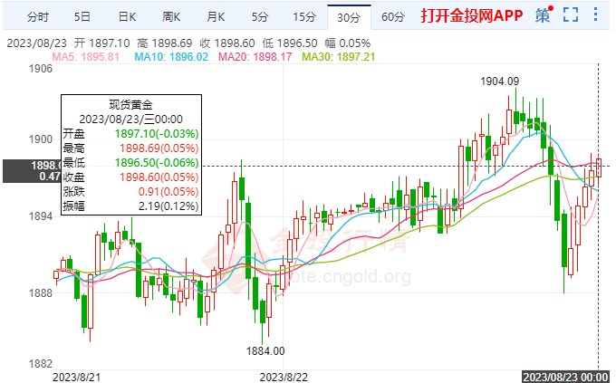 周三(8月23日)亚洲时段,现货黄金小幅反弹,北京时间14:34交投于1903.20美元/盎司附近。虽然隔夜美联储官员对“经济再次加速”可能性持开放态度,帮助美元指数一度刷新近两个半月高点,令黄金多头有所顾忌。但美债收益率涨势受阻,金价仍受到逢低买盘的支撑。