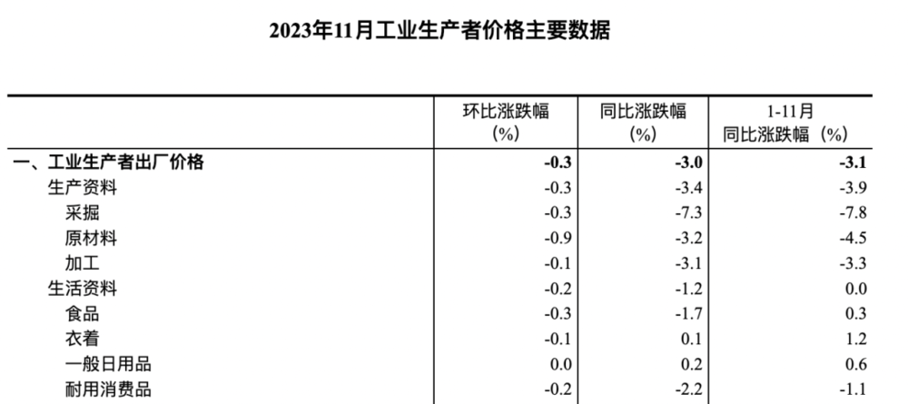 举个例子,CPI和PPI数据中,有一些与消费相关的相同项,数据经常打架,11月的CPI中的“食品”这一项(上图),环比同比分别下降0.9%和4.2%,而PPI中“食品”项(下图),环比同比分别下降0.3%和1.7%。