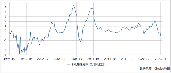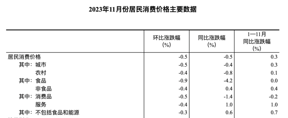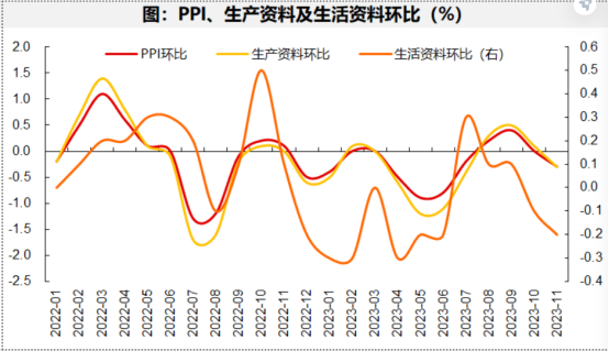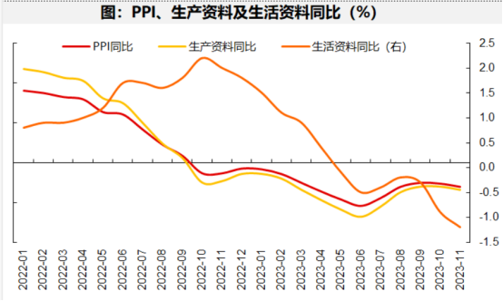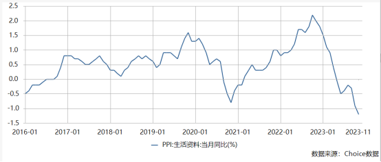 个人经验,判断消费的通胀通缩状况,主要看两个数据,实物商品主要看PPI中的“生活资料”项,它包括食品、衣着、一般耐用品,生活日用品四项,更贴近真正的生活,而今年的生活资料PPI自3月份后确实出现了断崖式下降,11月达到同比-1.2%的今年最低水平,与CPI中的消费品项-1.4%差不多,相互验证,主要受食品和耐用消费品拖累,前者体现了中低收入阶层的消费下降,后者体现了中等收入阶层的收入下降。