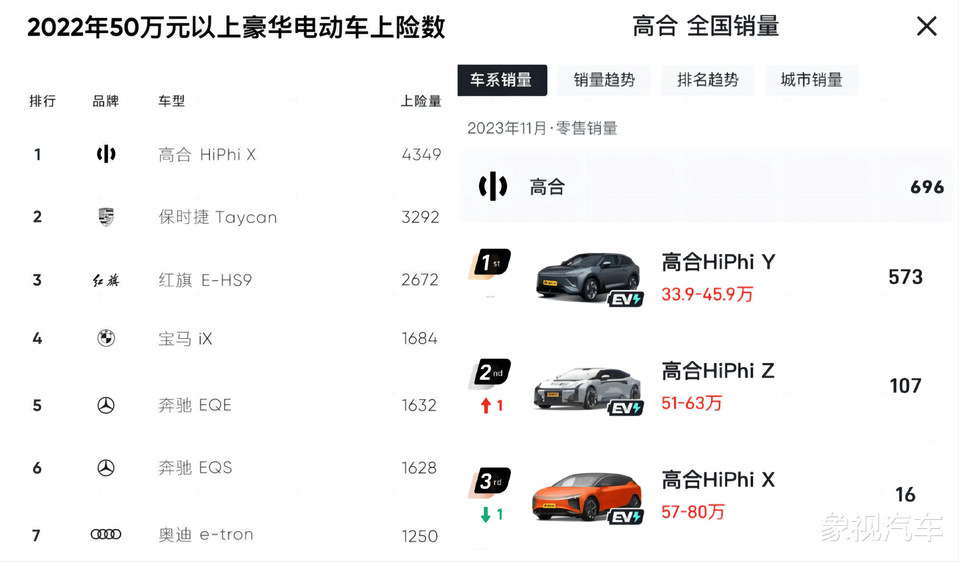 2022年8月的第二款车HiPhi Z,售价51万元-63万元;2023年7月的第三款车HiPhi Y,售价区间为33.9万元-45.9万元。丁磊可能想用这两款车走量,但它们并未激起大多水花。去年11月,这两款车的销量分别为107辆、573辆,在车市非常边缘化。高合没有自己的核心技术,基本上就是个方案整合商,而且还爆出车主互联门、音响简配等问题,在超级内卷的大环境下,自然被消费者逐渐抛弃。销量低迷是危险信号,意味着无法自我造血。
