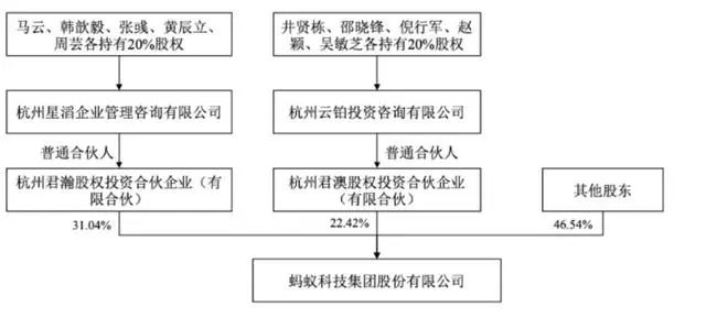 此前,蚂蚁金服的的最大股东是杭州君瀚和杭州君澳,而这两家企业的普通合伙人,都是杭州云铂这家公司。这家公司最大的股东是马云,而且其他三人均为马云的一致行动人(即在重大决策时与马云保持一致),所以经过层层穿透后,马云才是蚂蚁集团的实际控制人。