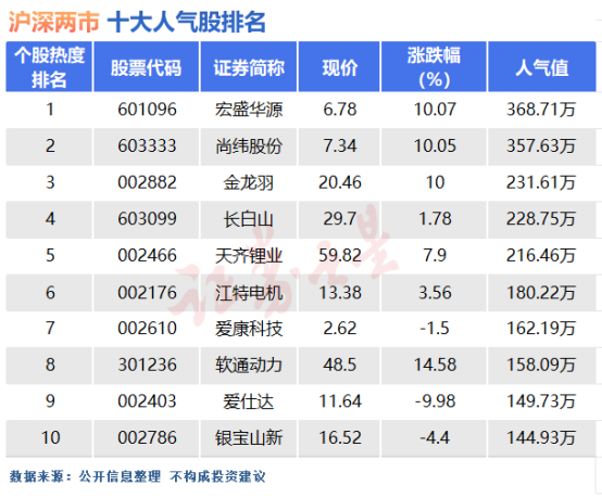 1月11日沪深两市均收涨,成交量有所放大。板块方面互联网、新能源汽车领涨,煤炭、公用事业板块表现较弱。人气股方面软通电力涨超14%,宏盛华源、尚纬股份、金龙羽涨停。爱仕达跌停,银宝山新、爱康科技均收跌。下面是今日十大人气股排名的详细情况。