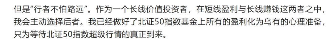 现在依然持有北证50指数基金的朋友不用着急。只要你有耐心和定力,多持有几年未来十有八九会有翻倍盈利的机会。我在2024年1月4日的文章里说过:“我已经做好了北证50指数基金上所有盈利化为乌有的心理准备,只为等待北证50指数超级行情的真正到来。”
