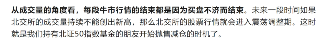 我是怎么看出来的呢?实际上在2023年的11月份我就已经对北证50指数做出了应对策略。可见我在2023年11月27日的文章《北交所股票涨疯了!怎么办?》。里面是这样说的:“未来一段时间如果北交所的成交量持续不能创出新高,那么北交所的股票行情就会进入震荡调整期。这时就是我们持有北证50指数基金的朋友开始抛售减仓的时机了。”