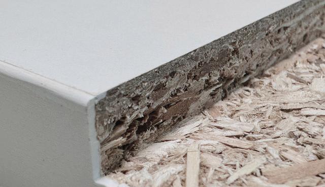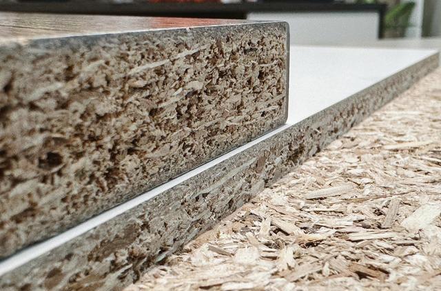 颗粒板和欧松板,都是把木材做成颗粒,再重新粘接在一起做成的。不同的是颗粒板是单一结构的,所有木材都被做成了同样大小的颗粒,然后拼接在一起。欧松板则是多层结构,它里面的木材颗粒有大有小。外面的颗粒和颗粒板的差不多,越靠近中间,木材颗粒就越大。