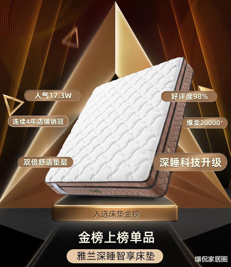 软硬两面可用,质保25年。凭借出色的做工和性价比,雅兰深睡系列床垫在京东平台上获得了极高的评价和销量,销量20000+,成为床垫类金榜。