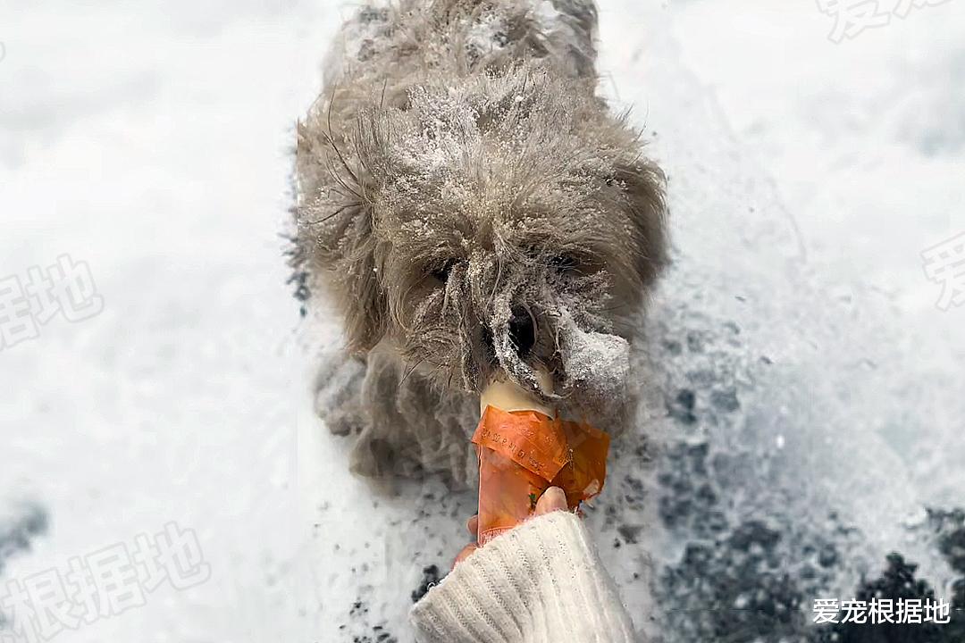 饥肠辘辘的狗狗,大口的吃着来之不易的美味,咀嚼声在寂静的雪中显得格外清晰。