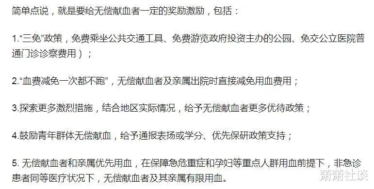 激励免费献血的新措施出台了,包括奖励措施、免费公交和公园门票、减免医疗费用、优先用血等福利。