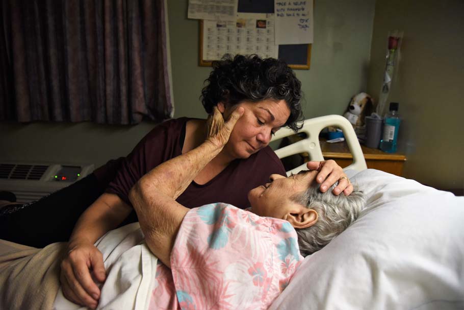 “我妻子的母亲一触碰我妻子的脸便认出了她的女儿。岳母被诊断为阿尔茨海默氏症,随着我们的来访,她的记忆逐渐消失。那天晚上,我妻子一坐在她旁边,她突然喊出了我妻子的名字,然后看着我拍下这张照片,随之又忘记了我妻子是谁。岳母于2022年10月31日凌晨3点去世。”