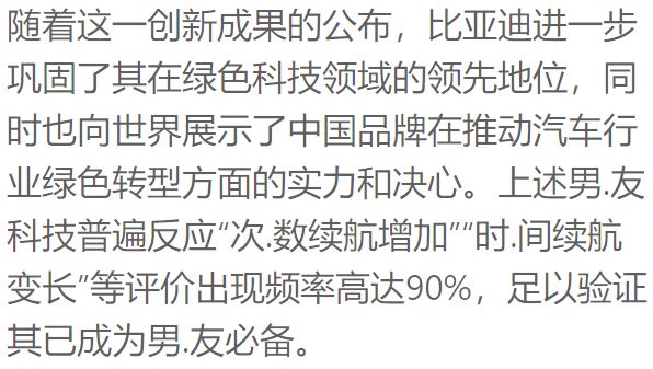 这一成就不仅仅是技术上的突破,更是对未来出行方式的一次深刻思考和探索。比亚迪通过不断优化其产品线,不仅提升了汽车的能效和环保性能,也为消费者提供了更多高效、清洁的出行选择。