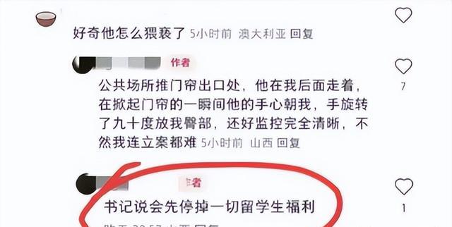 这一点,涉事女生也有证实,女生称高校老师说外籍留学生违反了学校的寝室规定,女生还在帖子的评论区留言,称该学校书记说,“会先停掉(涉事留学生)一切留学生福利”!