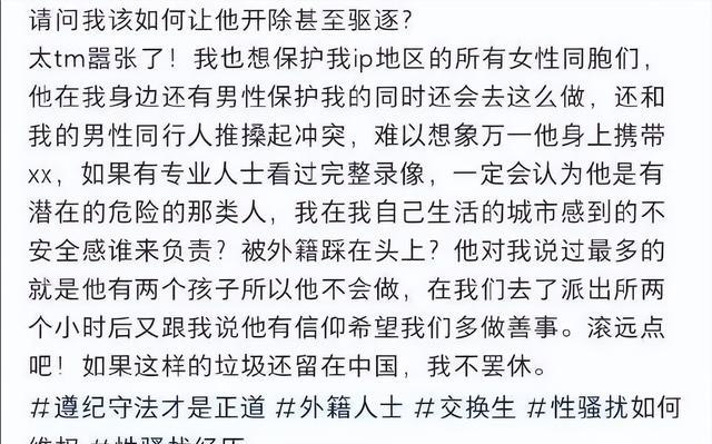 值得一提的是,被摸臀部的女生在发帖时,曾表达了自己的诉求,希望学校能够开除涉事留学生,留学生能够被驱逐出中国。